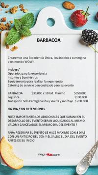 Valor y costos: Experiencia Barbacoa $35.000 x 10 Ud. minimo / Logística $ 100,000 / Transporte solo Cartagena $ 200,000