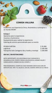 Valor y costos: Experiencia Picada surtida $35.000 / Logística $ 100,000 / Transporte solo Cartagena $ 200,000