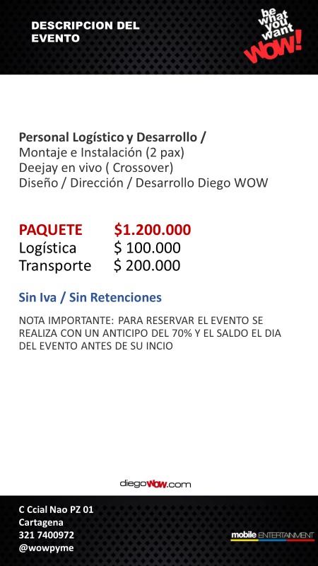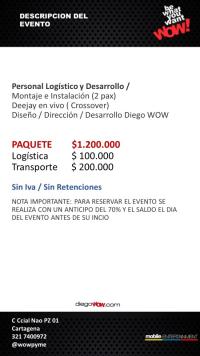 Valor y costos :  Experiencia Deejay profesional con 2 cabinas de 15" Pro. Evento de celebración de cumpleaños $ 1.200.000 + logística $ 100.000 + Transporte solo Cartagena $ 200.000