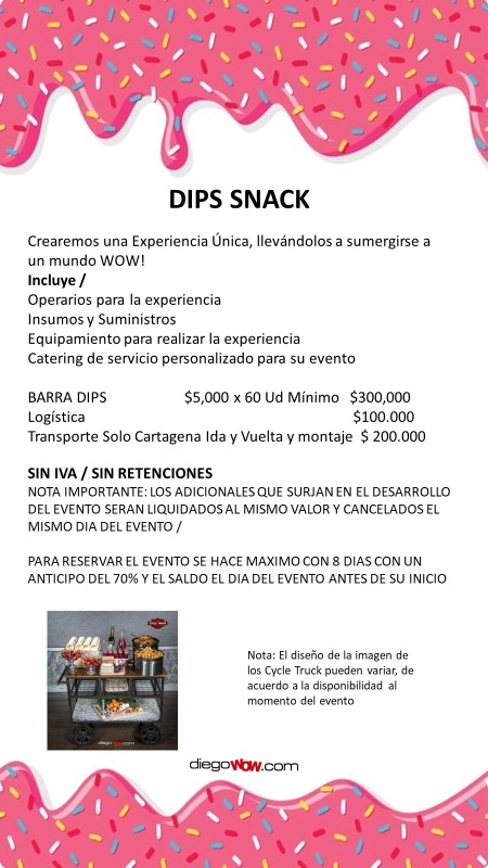 Valor y costos: Dips $5,000 x 60 Ud Mínimo / Logística $ 100,000 / Transporte solo Cartagena $ 200,000