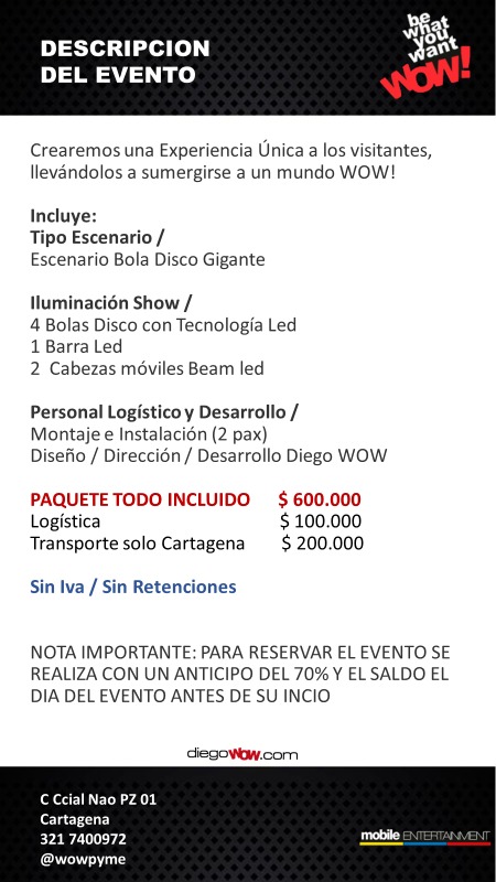 Valor y Costos: Escenografía Bola Disco $ 600.000 + Logística $ 100.000 + Transporte solo Cartagena $ 200.000