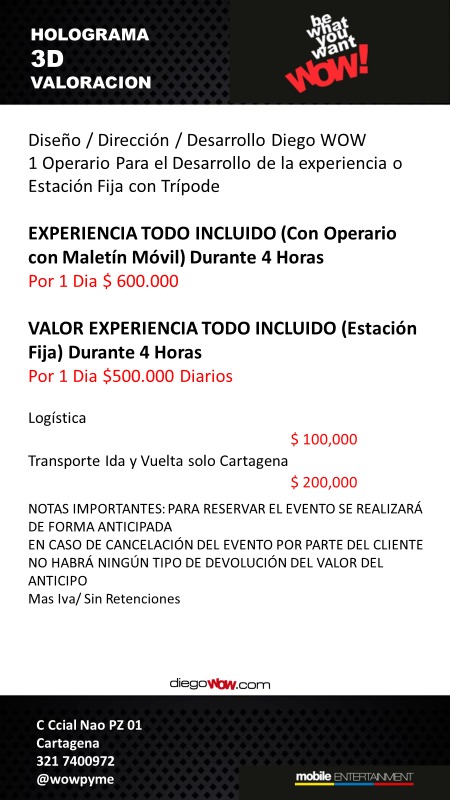 Valor y costos: Experiencia 4 horas con Operario Maletín Móvil $600.000 / Estación fija 4 Horas $500.000 / Logística $ 200,000 / Transporte solo Cartagena $200,000
