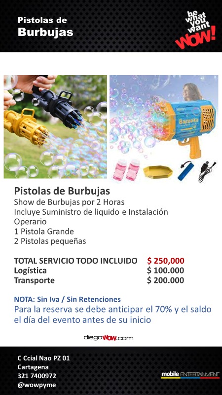 Valor y Costos: Maquina de burbujas $ 250.000 / 3 Pistolas de burbujas $250.000 / Logística $ 100.000 / Transporte solo Cartagena $ 200.000