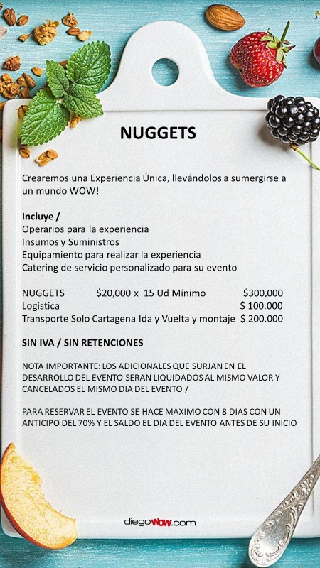 ¡Satisface tus antojos con nuestros deliciosos Nuggets de Pollo! Preparados con tierno pollo apanado y acompañados de papitas crujientes, son la opción perfecta para cualquier momento del día. Sumérgete en el placer de cada bocado y acompáñalos con nuestras salsas especiales de la casa, que realzan su sabor único.