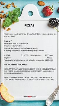 Valor y costos: Experiencia Pizzas $10,000 x 25 Ud Mínimo / Logística $ 100,000 / Transporte solo Cartagena $200,000