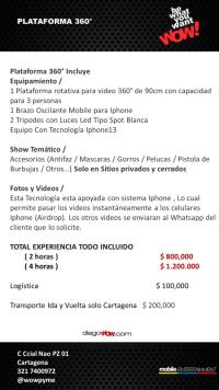 Valor y costos: Experiencia 2 HORAS $800.000 / 4 HORAS $1.200.000 / Logística $ 100,000 / Transporte solo Cartagena $ 200,000