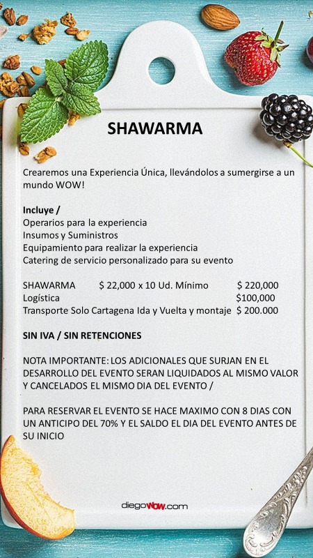 Valor y costos: Shawarma $22.000 x 10 Ud. Mínimo / Logística $ 100,000 / Transporte solo Cartagena $ 200,000