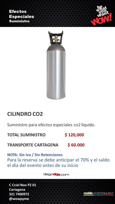 "¡Potencia tu evento con nuestro cilindro de CO2! Ya sea para crear efectos especiales en una fiesta, concierto o evento corporativo, nuestro cilindro de CO2 es la solución perfecta. Con la posibilidad de crear impresionantes nubes de humo frío y efectos visuales impactantes, este cilindro te garantiza una experiencia única y memorable. ¡No dejes pasar la oportunidad de destacar con nuestro cilindro de CO2!