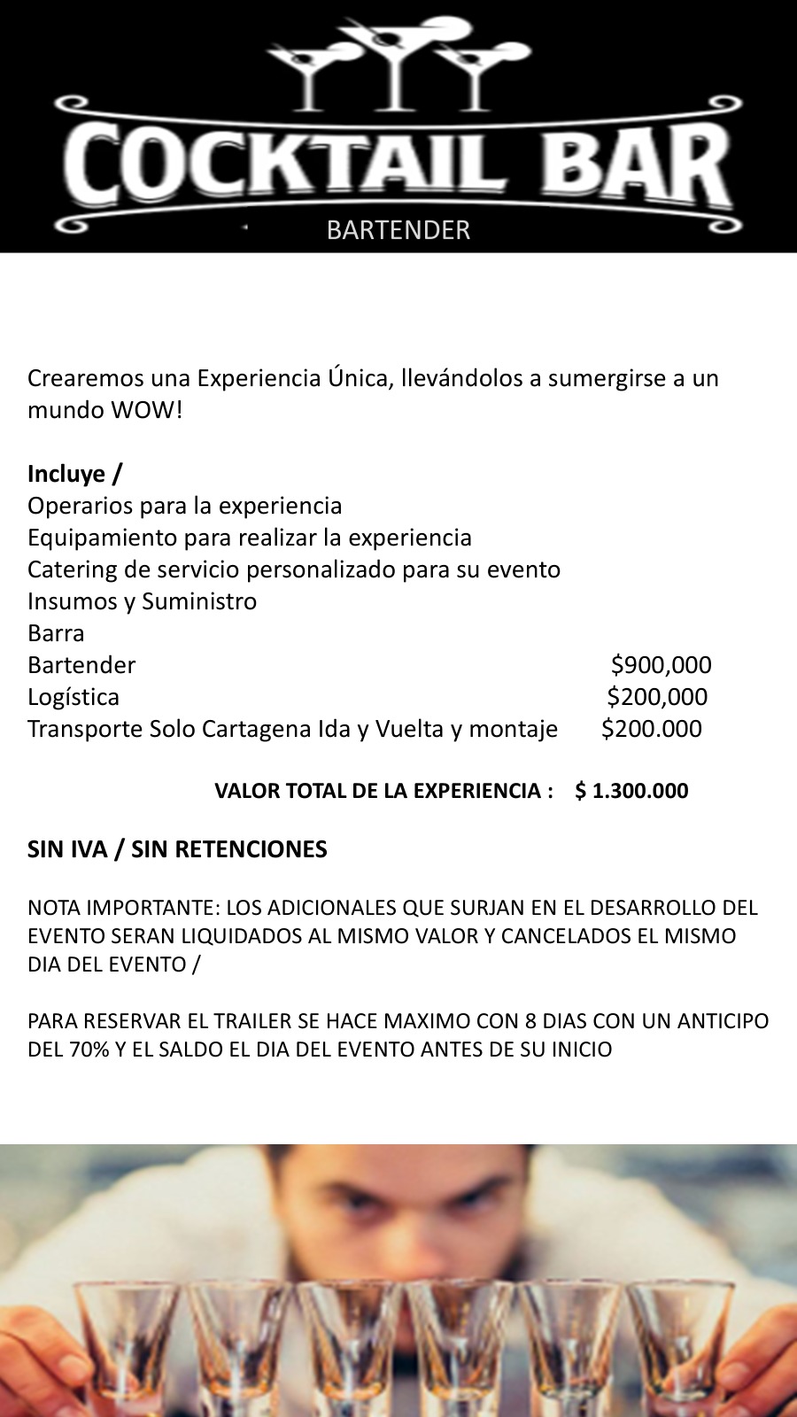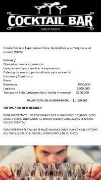 Valor y costos: Bartender $900.000 / Logística $ 200,000 / Transporte solo Cartagena $ 200,000