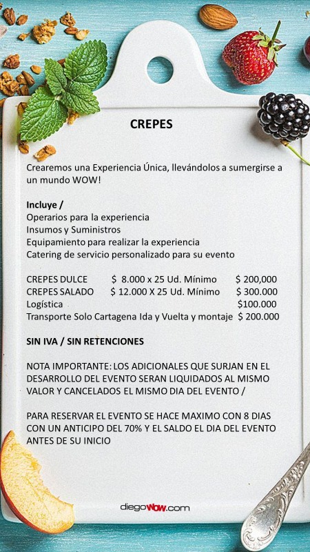 Valor y costos: Experiencia Crepes Dulces $8,000 x 25 Ud Mínimo / Crepes Salados $12,000 x 25 Ud Mínimo / Logística $ 100,000 / Transporte solo Cartagena $ 200,000