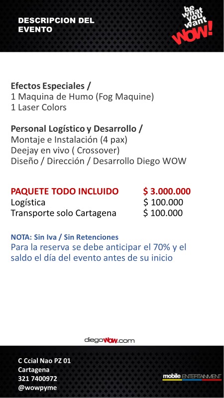 Valor y Costos: Escenario $ 3.000.000 + Logística $ 100.000 + Transporte solo Cartagena $ 200.000