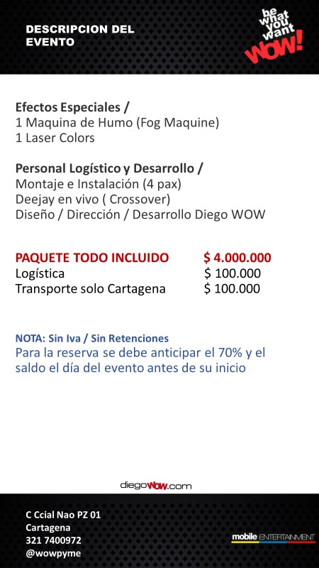 Valor y Costos: Escenario con Video $ 4.000.000 + Logística $ 100.000 + Transporte solo Cartagena $ 200.000
