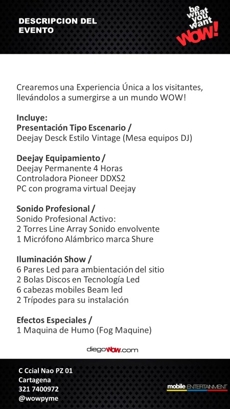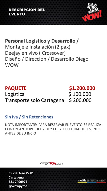 Valor y Costos: sonido envolvente $ 1,200,000 + Logística $ 100,000 + Transporte solo Cartagena $ 200,000
