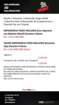 Valor y costos: Experiencia 4 horas con Operario Maletín Móvil $600.000 / Estación fija 4 Horas $500.000 / Logística $ 200,000 / Transporte solo Cartagena $200,000