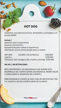 Valor y costos: Hot Dog $12.000 x 30 Ud. Mínimo / Logística $ 150,000 / Transporte solo Cartagena $ 200,000