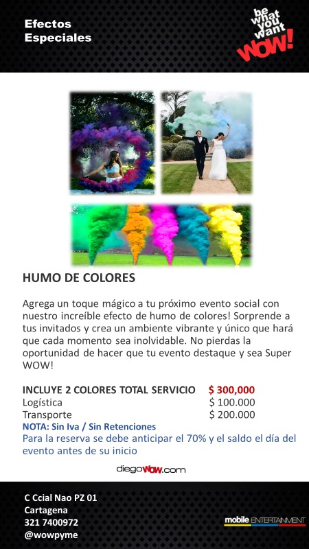 Valor y Costos: Humo de Colores $300.000 + Logística $ 100.000 + Transporte solo Cartagena $ 200.000