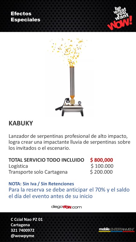 Valor y Costos: KABUKY $800.00 + Logística $ 100.000 + Transporte $ 200.000