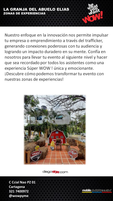 Nuestro enfoque en la innovación nos permite impulsar tu empresa o emprendimiento a través del trafficker, generando conexiones poderosas con tu audiencia y logrando un impacto duradero en su mente. Confía en nosotros para llevar tu evento al siguiente nivel y hacer que sea recordado por todos los asistentes como una experiencia Súper WOW ! única y emocionante. ¡Descubre cómo podemos transformar tu evento con nuestras zonas de experiencias!