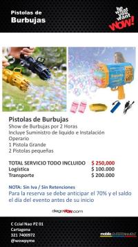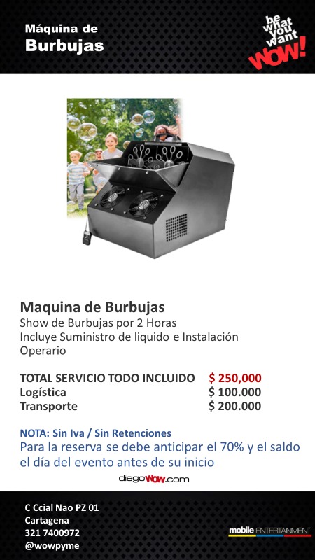 Valor y Costos: Maquina de burbujas $ 250.000 / 3 Pistolas de burbujas $250.000 / Logística $ 100.000 / Transporte solo Cartagena $ 200.000