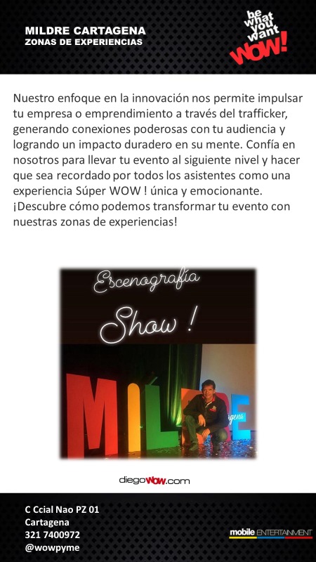 Nuestro enfoque en la innovación nos permite impulsar tu empresa o emprendimiento a través del trafficker, generando conexiones poderosas con tu audiencia y logrando un impacto duradero en su mente. Confía en nosotros para llevar tu evento al siguiente nivel y hacer que sea recordado por todos los asistentes como una experiencia Súper WOW ! única y emocionante. ¡Descubre cómo podemos transformar tu evento con nuestras zonas de experiencias!