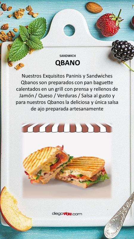 Nuestros Exquisitos Paninis y Sandwiches Qbanos son preparados con pan baguette calentados en un grill con prensa y rellenos de Jamón / Queso / Verduras / Salsa al gusto y para nuestros Qbanos la deliciosa y única salsa de ajo preparada artesanamente.