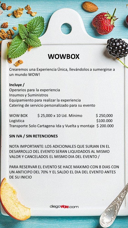 Valor y costos: Wow Box $25.000 x 10 Ud. Mínimo / Logística $ 100,000 / Transporte solo Cartagena $ 200,000
